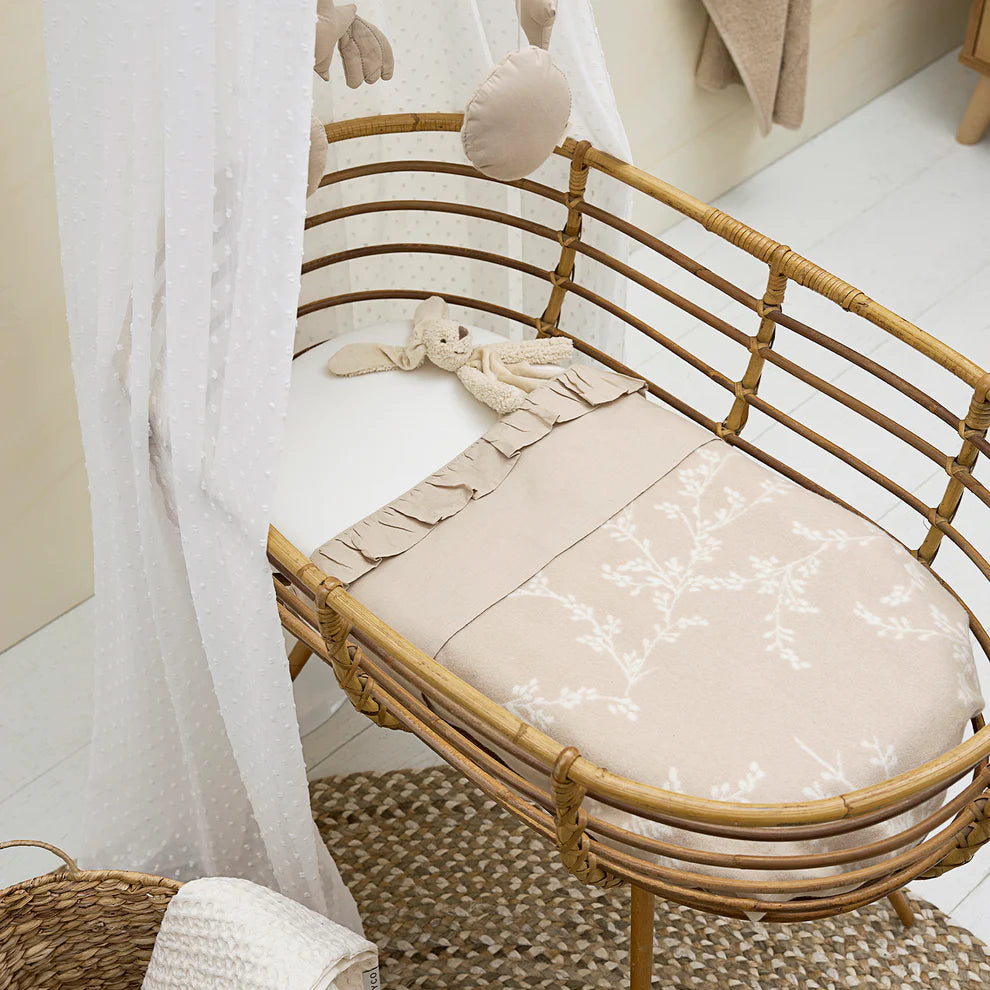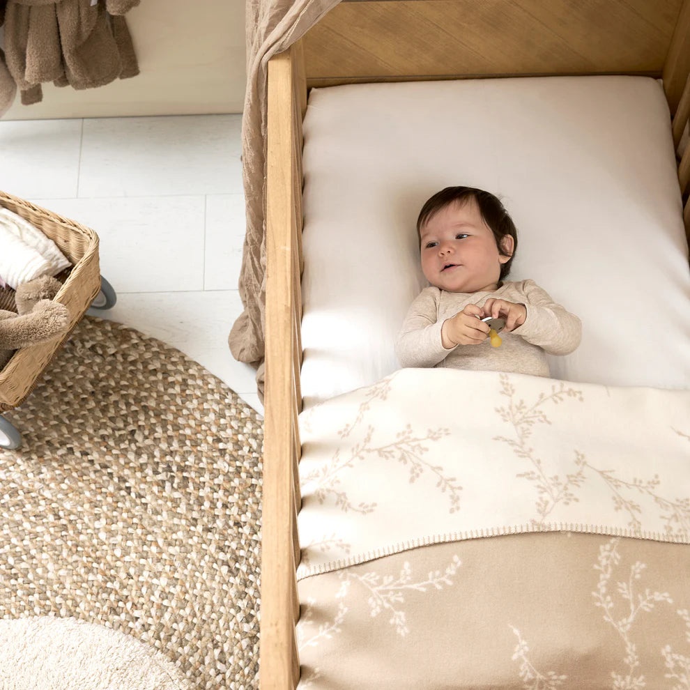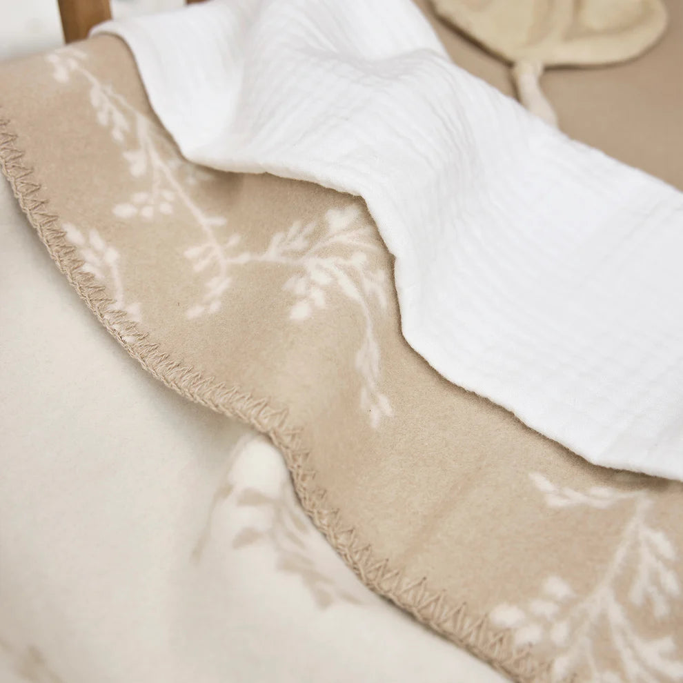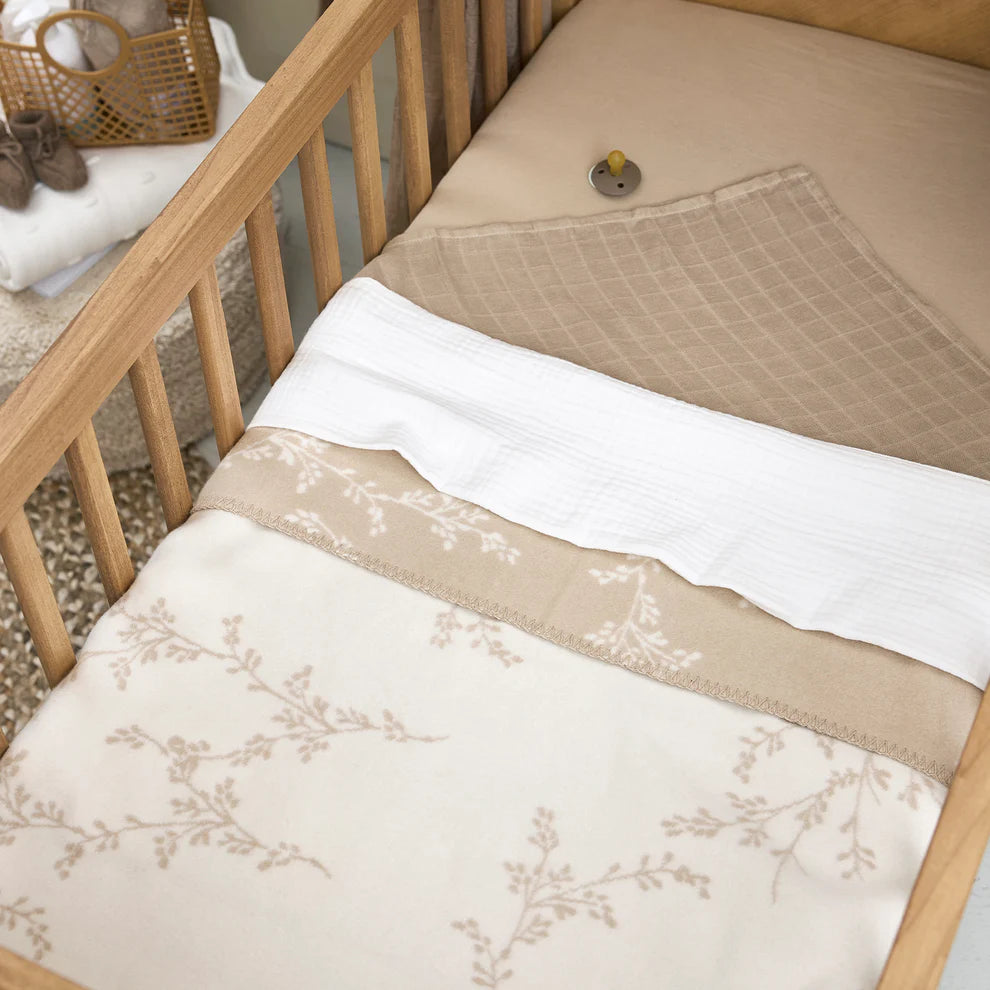 Das natürliche Branches Muster in Sand Melange bringt Ruhe und Wärme ins Kinderzimmer und lässt sich wunderbar mit der gesamten Meyco Baby Kollektion kombinieren. Die Decke ist in zwei Größen erhältlich 75 x 100 Zentimeter für Wiege oder Kinderwagen und 100 x 150 Zentimeter für das Kinderbett. Dank ihrer Vielseitigkeit kann sie später auch als Kuscheldecke oder Plaid auf dem Sofa verwendet werden.