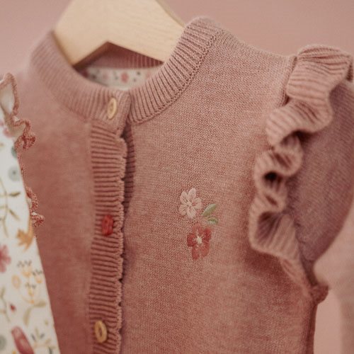 Zart, warm und einfach bezaubernd die gestrickte Weste in Rosa bringt dank Rüschen und feiner Blumenstickerei märchenhaften Fairy Garden Charme in jedes Outfit. Aus weicher Bio-Baumwolle gefertigt, hält sie dein Baby kuschelig warm und rundet jedes Outfit liebevoll ab.