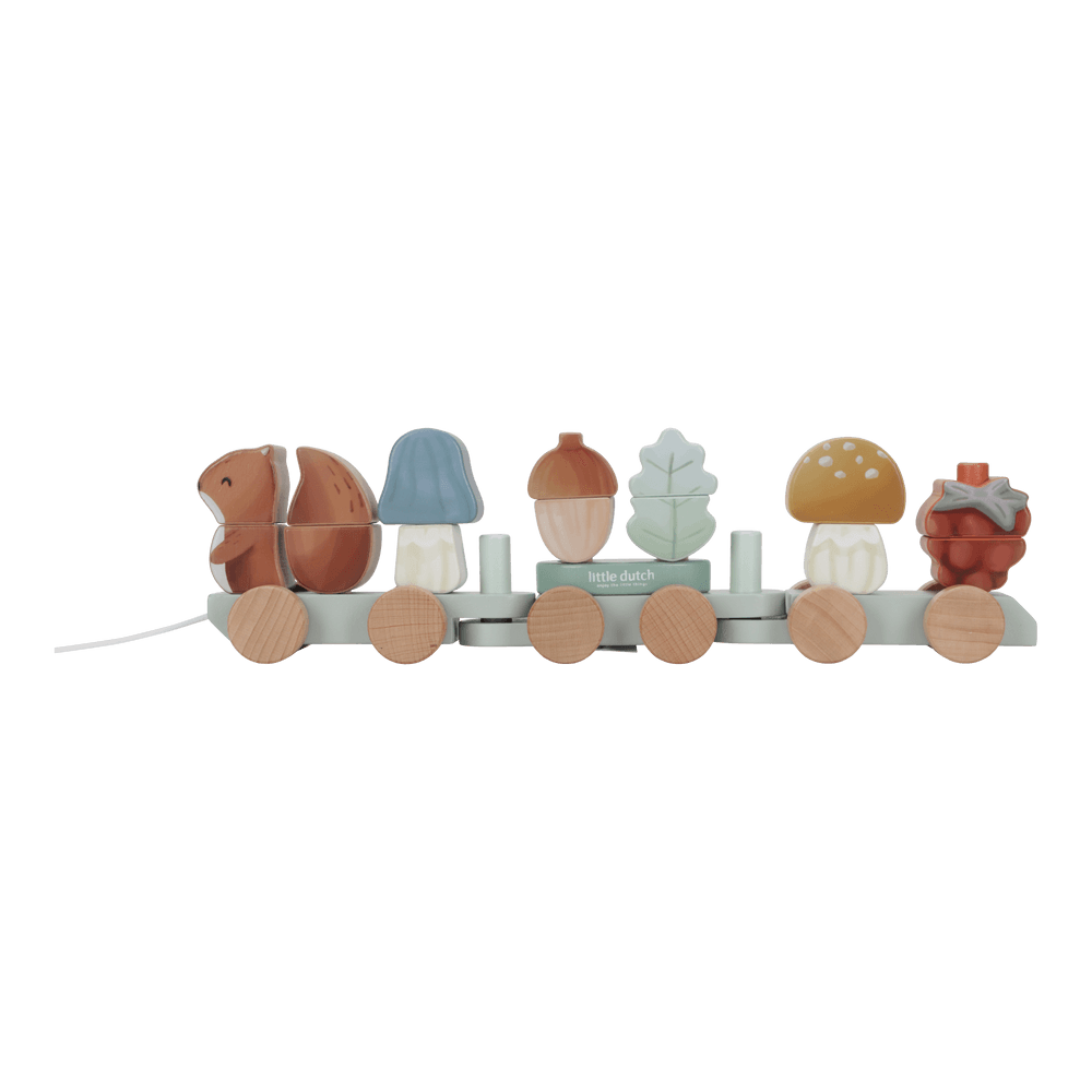 Der personalisierte Holz-Zug von Little Dutch gehört zur naturverbundenen Forest Friends Kollektion und besticht durch detailreiche Holzfiguren wie Eichhörnchen, Pilze, Blätter und Waldmotive. Die Bausteine lassen sich flexibel stapeln und bieten Platz für individuelle Lasergravuren wie Name, Taufdatum oder kleine Symbole. Die Gravur ist dauerhaft und fein ausgearbeitet, sodass der Zug auch langfristig als Erinnerungsstück bestehen bleibt. Die sanften, natürlichen Farbtöne verleihen dem Produkt eine warme, moderne Optik.
