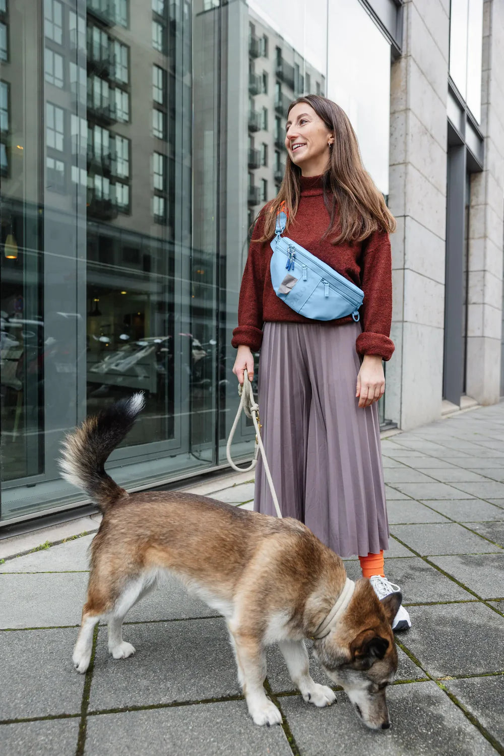 Gefertigt aus recyceltem Polyester mit robuster Polyurethanbeschichtung überzeugt die Bum Bag durch Strapazierfähigkeit, schmutz- und wasserabweisende Eigenschaften sowie Pflegeleichtigkeit. Selbst bei Regen bleibt die Tasche zuverlässig und ist im Handumdrehen wieder einsatzbereit. Der abnehmbare Schultergurt ist längenverstellbar von 112 bis 120 Zentimeter und garantiert bequemen Tragekomfort. Die Leckerlitasche Emma wurde gemeinsam mit Hundeexpertinnen und Hundeexperten entwickelt und verbindet Alltagstauglichkeit mit einem stilvollen Look. In Hellblau ist sie ein modernes Accessoire, das jede Gassirunde und jedes Training erleichtert.