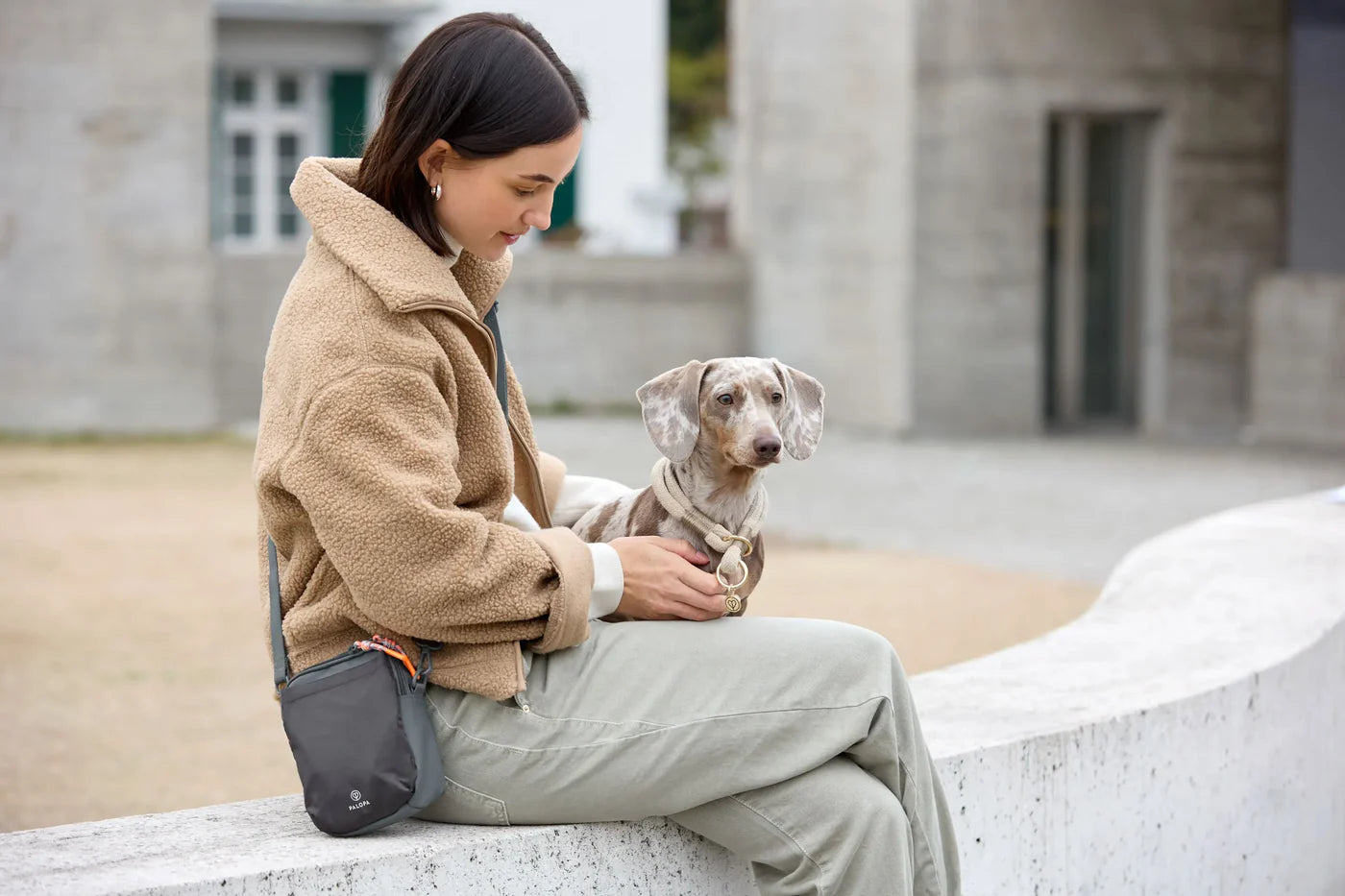 Durch den Karabinerhaken oder den abnehmbaren Schultergurt kann die Tasche flexibel als Bauchtasche, Schultertasche oder per Gürtelclip getragen werden. Damit ist Greta eine stilvolle und funktionale Lösung für Hundebesitzerinnen und Hundebesitzer, die Wert auf Komfort und Ordnung legen. Gemeinsam mit Hundeexpertinnen und Hundeexperten entwickelt, vereint der Leckerlibeutel Greta modernes Design, praktische Features und hochwertige Verarbeitung. Er ist ideal für alle, die mit ihrem Vierbeiner aktiv unterwegs sind.