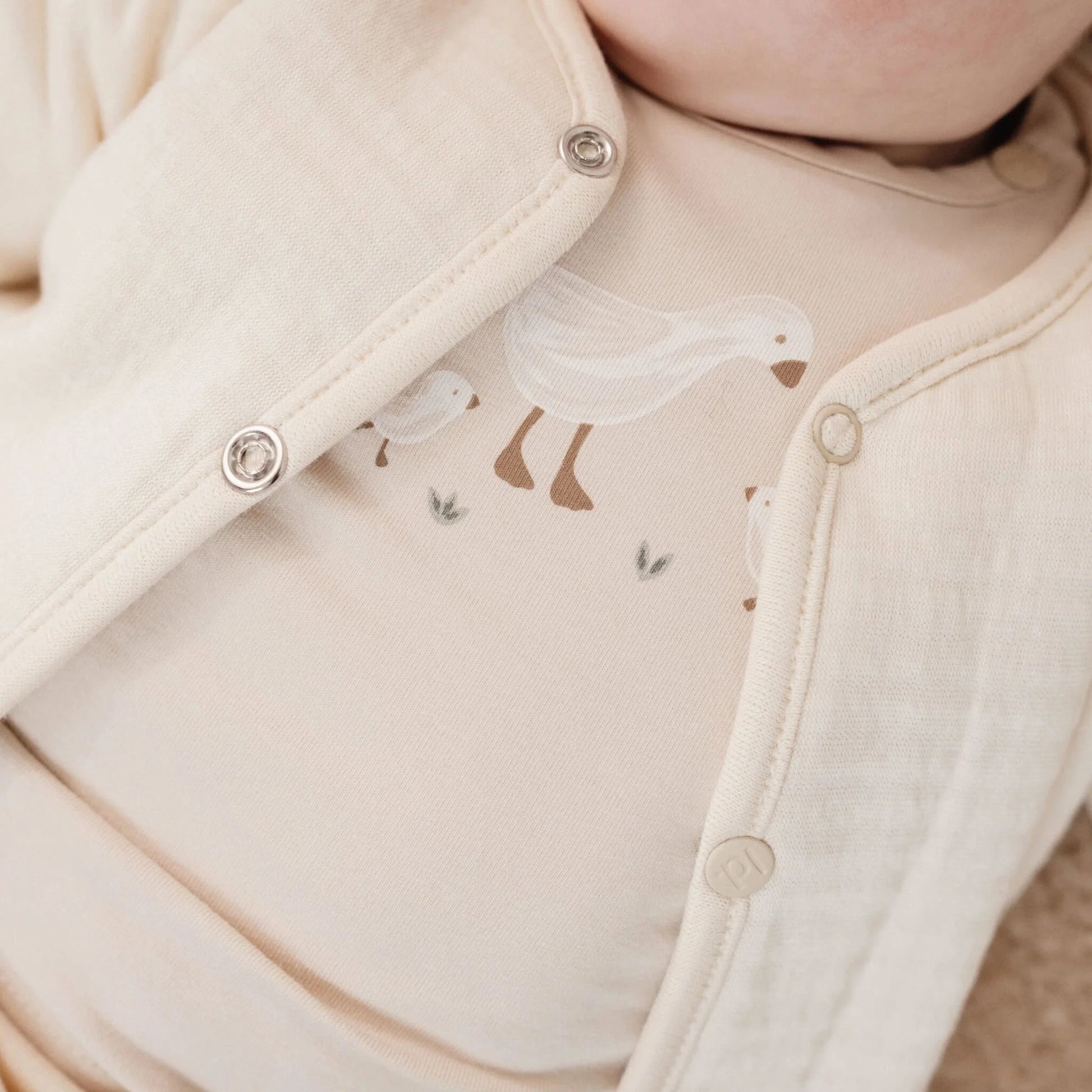 Weiches Langarmshirt aus Bio-Baumwolle in Sand mit süßer kleiner Gans auf der Brust. Dank der Knöpfe am Hals lässt es sich besonders leicht an und ausziehen perfekt für jeden Tag.