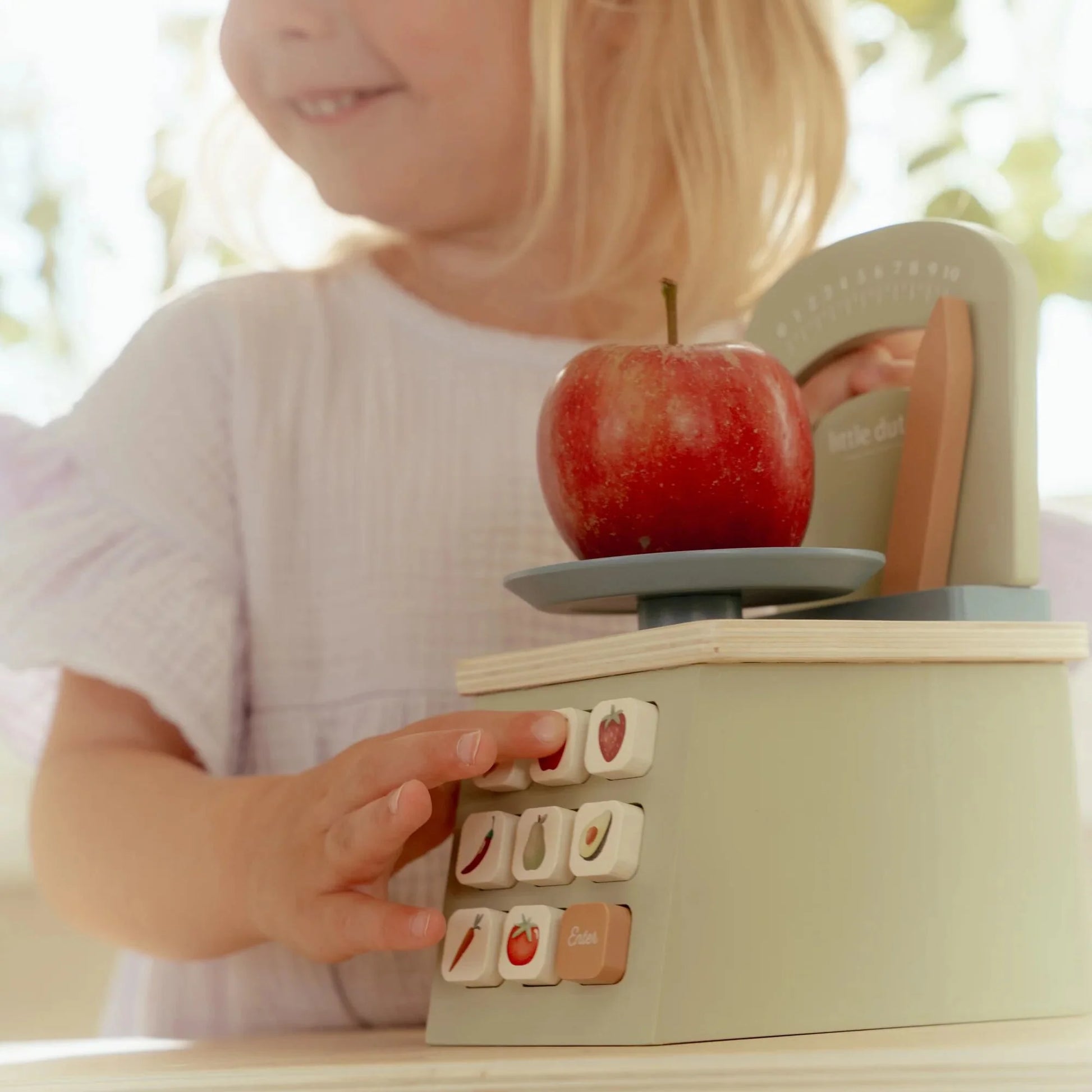 Die Little Dutch Holzspielwaage in Grün ist die perfekte Ergänzung für jede Spielküche. Mit dieser detailgetreuen Waage können kleine Bäcker und Köche ihre Zutaten wie echte Profis abwiegen. Wird etwas auf die Waage gelegt, zeigt der Zeiger das Gewicht an und sorgt so für realistischen Spielspaß. Die Spielwaage verfügt über Knöpfe mit Illustrationen, die das Rollenspiel noch spannender machen. Hergestellt aus FSC-zertifiziertem Holz, überzeugt sie durch Stabilität und hochwertige Verarbeitung. Mit ihrer kompakten Größe von 13,7 x 19,4 x 9,8 cm passt sie in jedes Kinderzimmer. Die Waage eignet sich für Kinder ab 3 Jahren, fördert Fantasie, Motorik und Kreativität und lässt sich perfekt mit der Little Dutch Spielküche oder dem Backset kombinieren.
