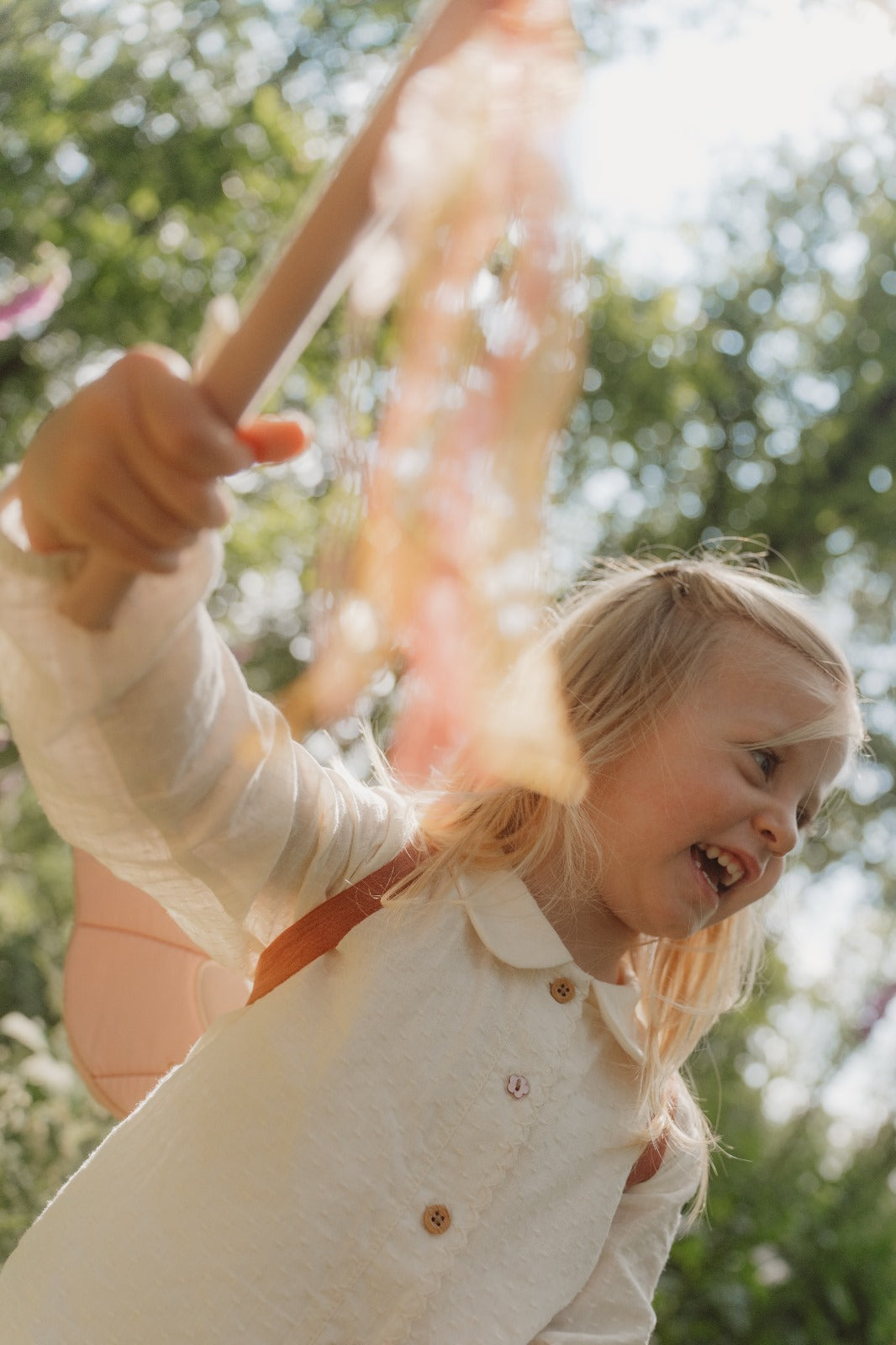 Die Little Dutch Feenflügel und der Zauberstab in Rosa aus der Fairy Garden Kollektion lassen Kinder in eine Welt voller Magie eintauchen. Das liebevoll gestaltete Set besteht aus zarten Flügeln mit elastischen Schultergurten, die sicheren Halt bieten, und einem funkelnden Zauberstab mit eleganten Bändern. So wird jedes Rollenspiel zu einem verzaubernden Erlebnis.