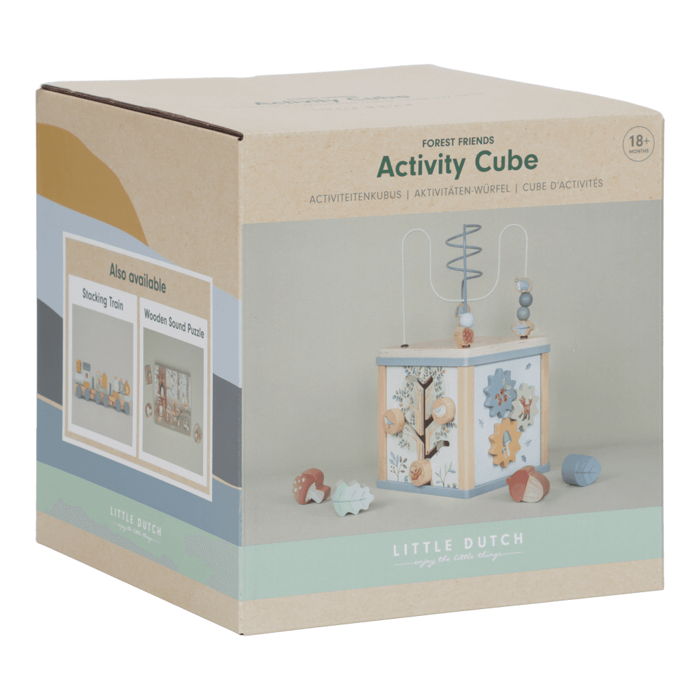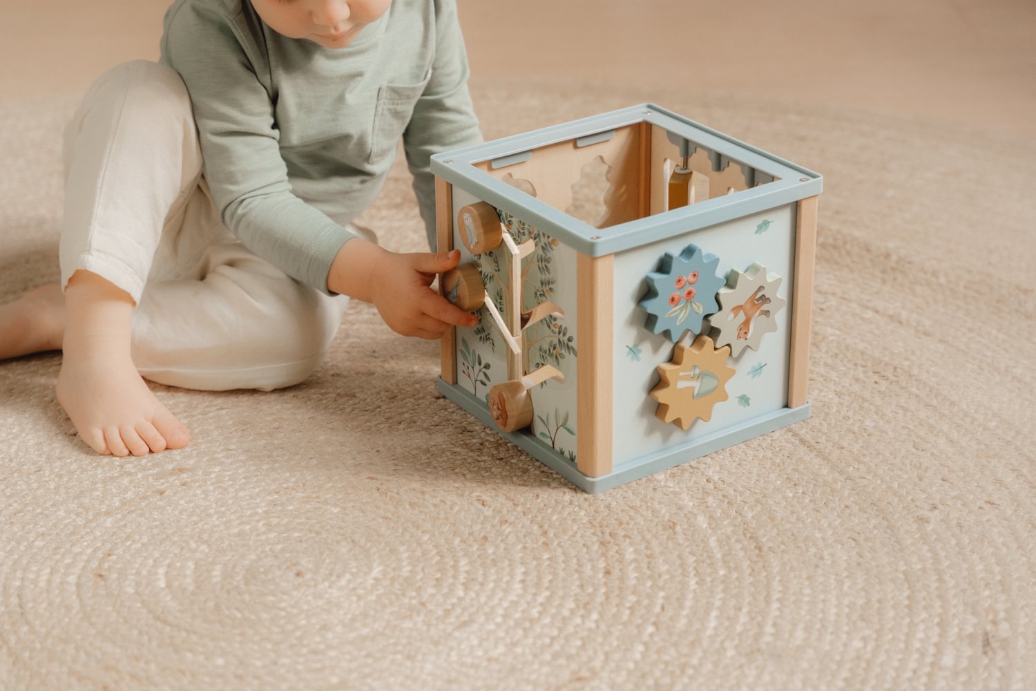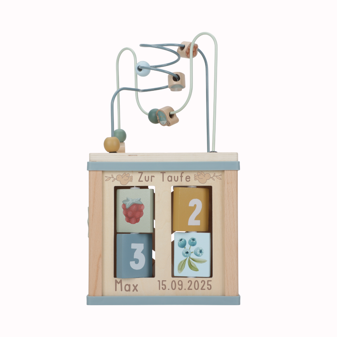 Der Motorikwürfel „Forest Friends“ von Little Dutch trägt die Artikelnummer LD7231 und die EAN 8713291772311. Er besteht aus robustem, hochwertigem Holz und ist in den sanften Naturfarben der Forest-Friends-Kollektion gestaltet. Jede Seite des Würfels ist liebevoll mit Motorikfunktionen wie Schiebeelementen, Steckformen, Zahnrädern oder einem Motoriklabyrinth ausgestattet, sodass Kinder altersgerecht gefördert werden. Die personalisierte Lasergravur – etwa Name oder Taufdatum – wird fein, dauerhaft und präzise eingearbeitet und macht den Würfel zu einem einzigartigen Erinnerungsstück zur Taufe. Dank der stabilen Verarbeitung eignet er sich ideal für langanhaltende Nutzung und tägliches Spielen.